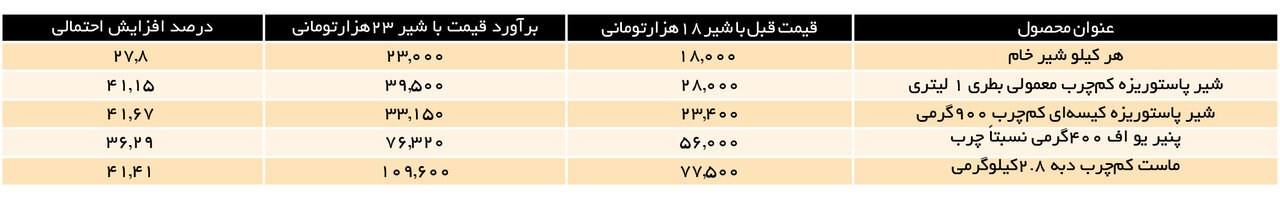 محاسبات مبتنی بر قیمت جدید شیر خام حاکی از این است که به فرض تکرار سناریوی سال قبل، به دنبال افزایش ۲۷.۸ درصدی قیمت شیر خام و رسیدن آن از کیلویی ۱۸ هزار تومان به کیلویی ۲۳ هزار تومان، قیمت شیر پاستوریزه کمچرب معمولی بطری ۱ لیتری از ۲۸ هزار تومان به بیش از ۳۹ هزار تومان خواهد رسید و قیمت شیر پاستوریزه کیسهای کمچرب ۹۰۰ گرمی نیز با همین رویه از ۲۳.۴ هزار تومان به بیش از ۳۳ هزار تومان افزایش خواهد یافت.