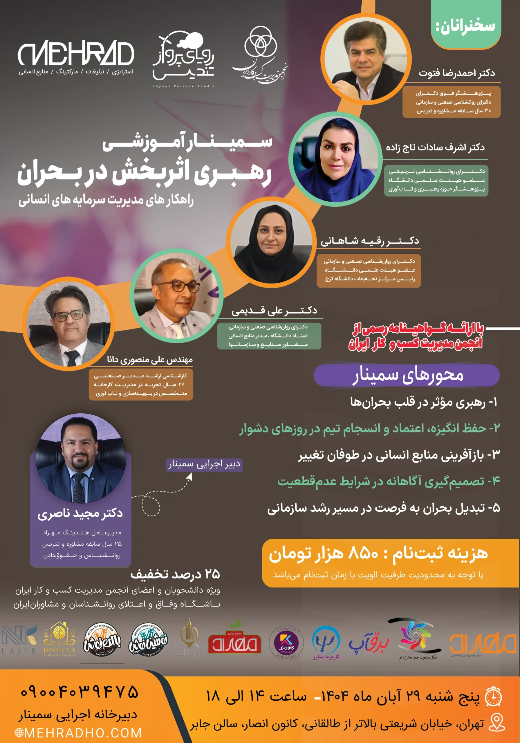 این همایش به میزبانی دکتر مجید ناصری ( مدیرعامل هلدینگ بین المللی مهراد ) با حضور و سخنرانی اساتید دانشگاهی و سازمانی، دکتر احمدرضا فتوت (پـــژوهــــشـگر حوزه صنایع و سازمان)، دکتر اشرف سادات تاج زاده ( روانشناس و عضو هیئت علمی دانشگاه) دکتر رقیه شاهانی(روانشناس و عضو هیئت علمی دانشگاه) دکتر علی قدیمی ( روانشناس و مشاور صنایع و سازمانها) مهندس علی منصوری دانا ( متخصص در بهینه سازی و تاب آوری) در شهر تهران، خیابان شریعتی بالاتر از طالقانی، کانون انصار، سالن جابر مورخه پنج شنبه ۲۹ آبان ماه ۱۴۰۴ ساعت ۱۴ الی ۱۸ برگزار خواهد شد.